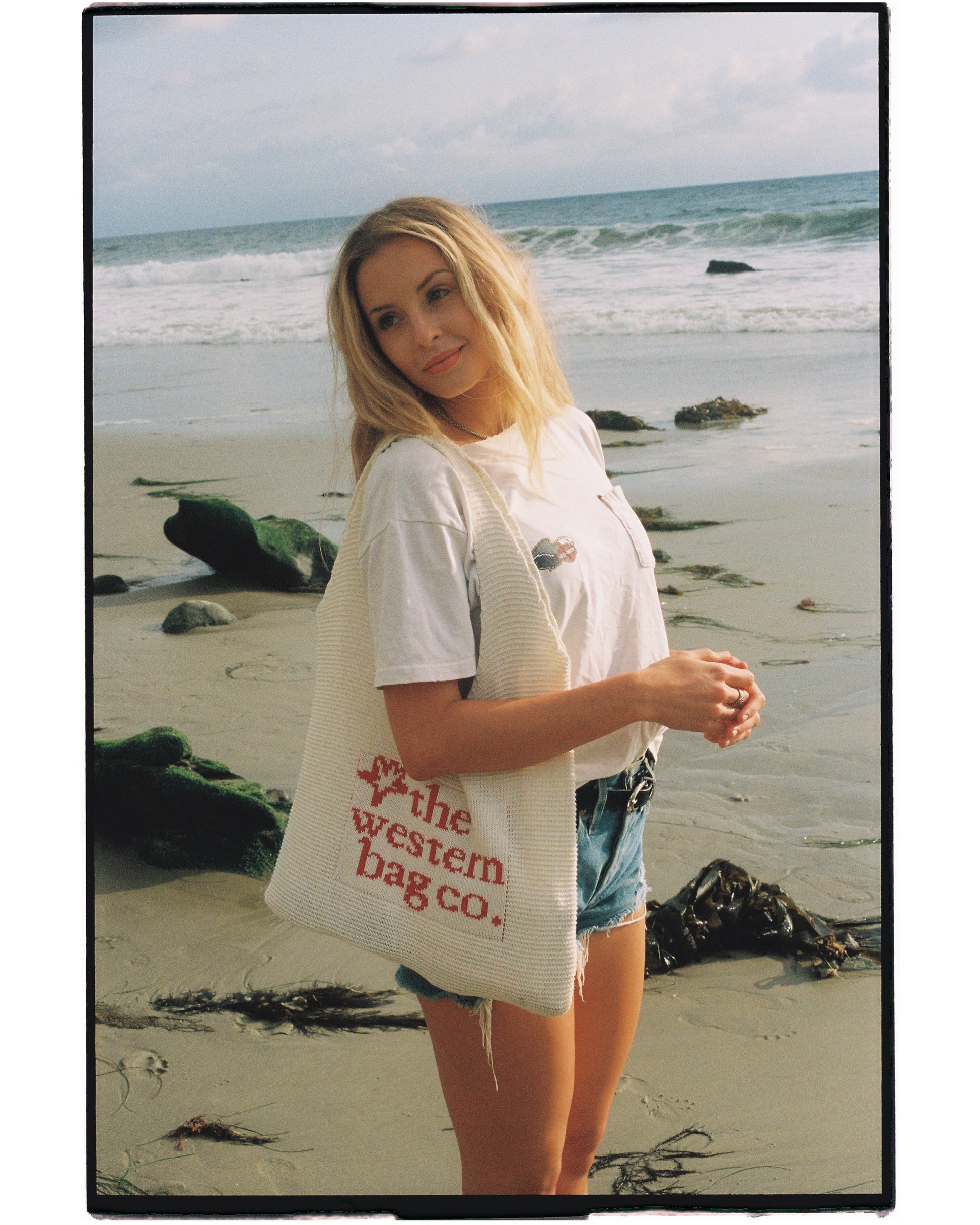 • Cozy knit tote in vintage white with Western rope-inspired pattern.
