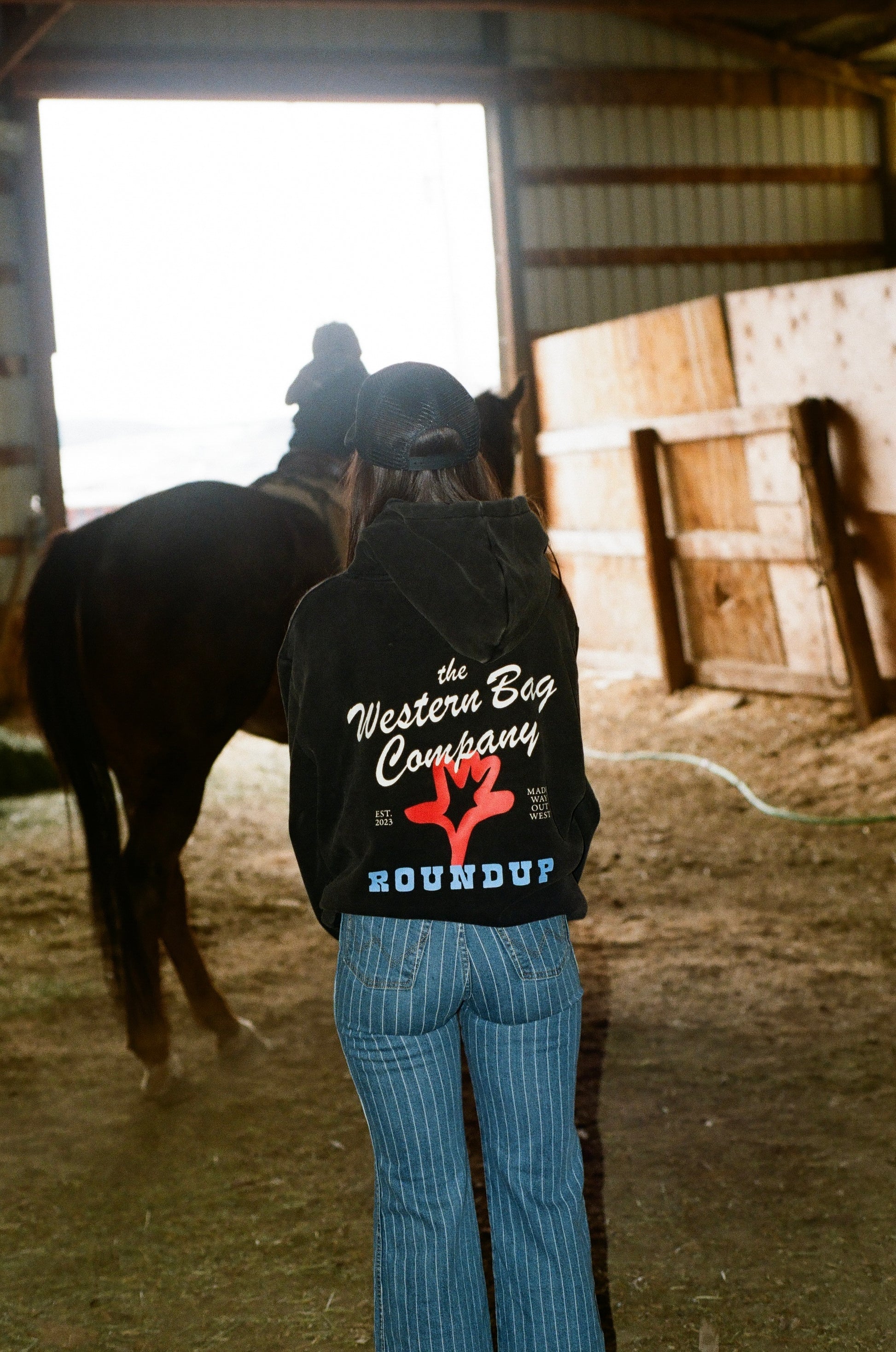 Crafted for those who chase horizons, The Roundup Hoodie blends modern comfort with a touch of western grit. Made from high-quality fleece fabric, this washed black hoodie is as soft as it is durable, built to handle everything from rugged trails to lazy mornings. Designed with a relaxed boxy fit and an oversized hood, it delivers a laid-back style that’s ready for anything. Featuring the Western Bag Co. logo, it’s the perfect layer for cooler days. Ships this January—get ready to saddle up in style.